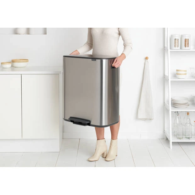 Op zoek naar een stijlvolle afvaloplossing voor je huishouden? Ontdek de modieuze Brabantia Bo pedaalemmer, een mooie en handige pedaalemmer met een inhoud van maar liefst 60 liter. Maar Bo is meer dan mooi. Deze design prullenbak past perfect tegen een muur of (keuken)kast en spaart dus ruimte. Het geurdichte deksel opent bij een licht tikje met je voet en blijft open zo lang als je wilt. En daarna sluit het fluisterzacht dankzij de soft-close techniek. De Antislip bodem beschermt de vloer en houdt de afvalemmer op zijn plaats.