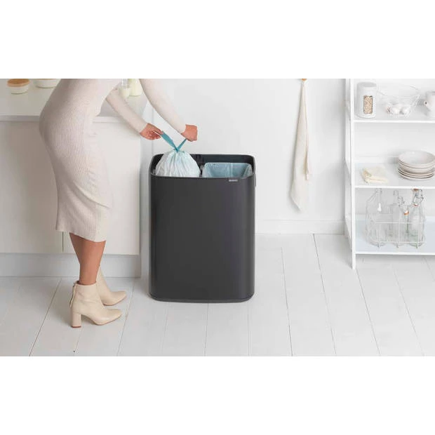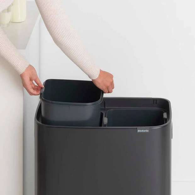 Op zoek naar een mooie oplossing om afval te scheiden? Deze Brabantia Bo Touch Bin combineert een prachtig design met een groot talent voor afval scheiden. Dankzij twee losse binnenemmers van 30 liter kan Bo 2 soorten afval aan. Bo past perfect tegen de muur en is erg stabiel. Makkelijk en licht te bedienen en sluit met de zachtste aanraking. De Bo Touch Bin is ontworpen met hart voor je huis en de planeet.