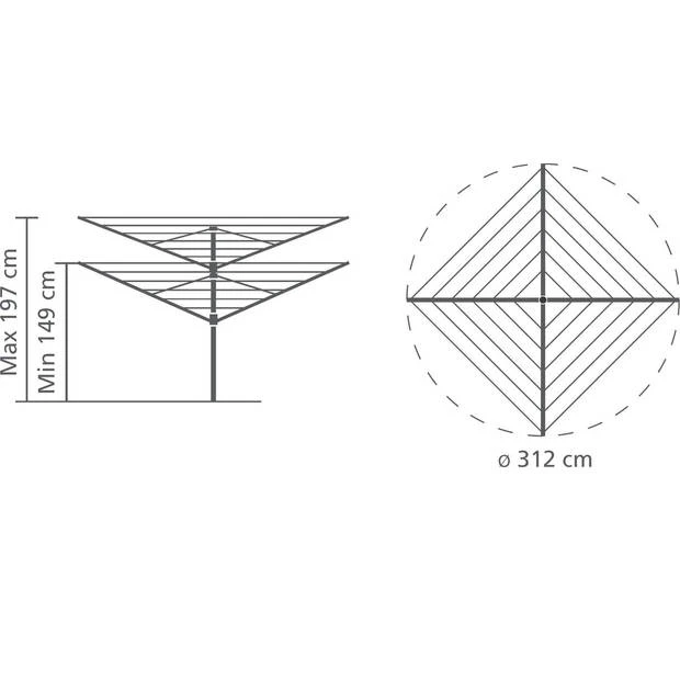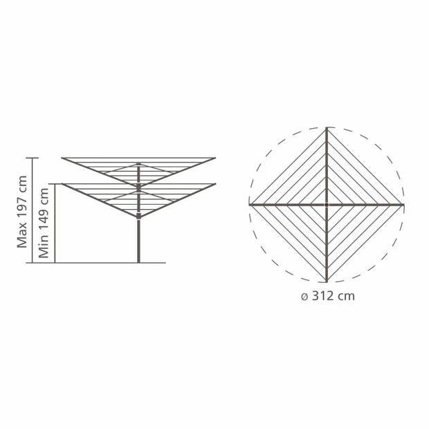 Deze Droogmolen is weerbestendig en zeer stabiel door de 50 mm diameter doorsnee aluminium buis. Er is meer dan voldoende ruimte voor een wasdag van het hele gezin, ideaal dus ook voor kussens en beddengoed. Bij een volle lading uit de wasmachine houdt u tussen het wasgoed nog voldoende ruimte over zodat we wind er goed tussendoor kan waaien en de was sneller droogt. De weersbestendige en robuuste armen zijn van gecoat staal en draaien ook met was soepel en moeiteloos rond. Daardoor hoeft u de wasmand niet rond de droogmolen te verplaatsen maar kunt u vanaf één plaats de was ophangen. Nog een voordeel is dat aan de uiteinden van de armen speciale, passende gaten voor kleerhangers zitten. De Lift-O-Matic Advance droogmolen past zich naadloos aan de ideale werkhoogte aan. De werkhoogte is traploos en met kleine stappen instelbaar tussen 149 en 197 cm. Door de ultralichte bediening- en het easy-lift systeem is de droogmolen superlicht te bedienen. Deze droogmolen is daardoor voor zowel grote als kleine mensen geschikt. Op de laagste positie is de Droogmolen zeer geschikt voor het luchten van uw kussens, dekens, dekbedden, slaapzakken, etc. Met het metalen grondanker staat deze droogmolen stevig in de grond. Beton is daardoor niet nodig. De voet is zo gemaakt dat deze geen obstakel vormt voor bijvoorbeeld uw grasmaaier. Doordat de grondanker in het gras verborgen zit kunt u er ook niet over struikelen. De metalen grondanker is afsluitbaar waardoor er geen vuil in komt. Door de standaard meegeleverde stijlvolle, weerbestendige polyester beschermhoes blijft uw molen droog en de drooglijnen schoon. De hoes is gemakkelijk aan te brengen en te verwijderen omdat deze een rits over de gehele lengte heeft. Uw wasknijpers heeft u altijd binnen handbereik met het weerbestendige wasknijpertas met ophanghaak.