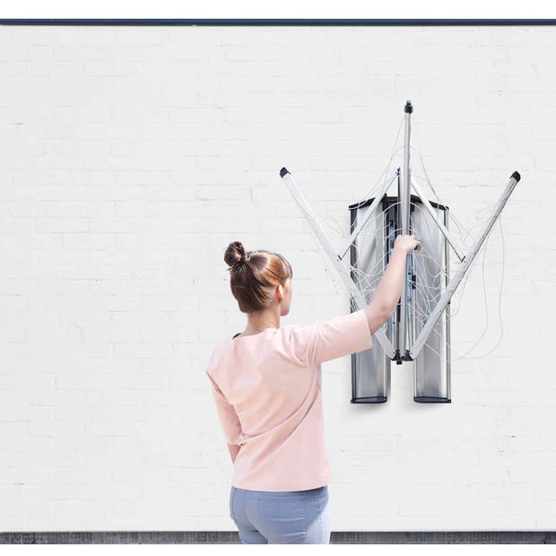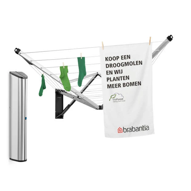 De Brabantia Wallfix wanddroger inclusief opberg-/beschermbox is eenvoudig aan de muur te bevestigen en neemt weinig plaats in beslag. Eenmaal aan de muur bevestigd is deze wanddroger altijd gebruiksklaar. Gemakkelijk en milieuvriendelijk je was drogen. De opberg-/beschermbox houdt de WallFix droog en de lijnen schoon en gaat door één druk op de knop ‘automatisch’ open. En alsof dat nog niet genoeg zou zijn: Brabantia en WeForest planten samen een boom voor elke droogmolen die verkocht wordt.